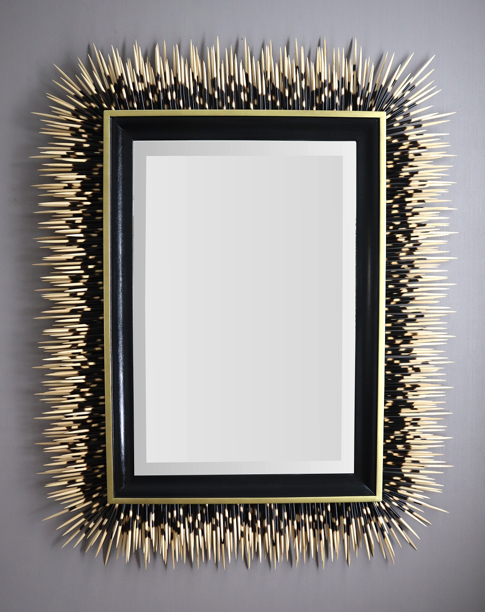 Red Notice, which Netflix said was its biggest movie debut of all time (as of 11/2021), features two 37” ivory-tip porcupine quill mirrors. I must admit, seeing mirrors I made in a $200 million budget movie was quite a thrill. Mounting the quill mirrors over aged mirror panels creates a clever doubling effect of the quills when viewed from the side.